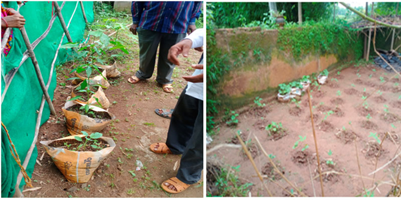 गाँव में घुसते हीं एक घर के बाहर हरे कपड़े से घिरे जमीन के टुकड़े पर नजर पड़ती है, पास जा कर देखा तो उस बाड़ के अन्दर की जमीन पर कई मौसमी सब्जियों के पौधे लगे थे, बैंगन, लहसुन, मकई, गोभी, मिर्च, प्याज ..