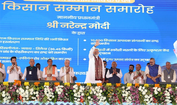 भागलपुर में किसान सम्मान समारोह में प्रधानमंत्री नरेंद्र मोदी ने प्रधानमंत्री किसान सम्मान निधि (पीएम-किसान) की 19वीं किस्त किसानों के खातों में भेजी। डीबीटी (प्रत्यक्ष लाभ अंतरण) द्वारा देश के 9.8 कर..